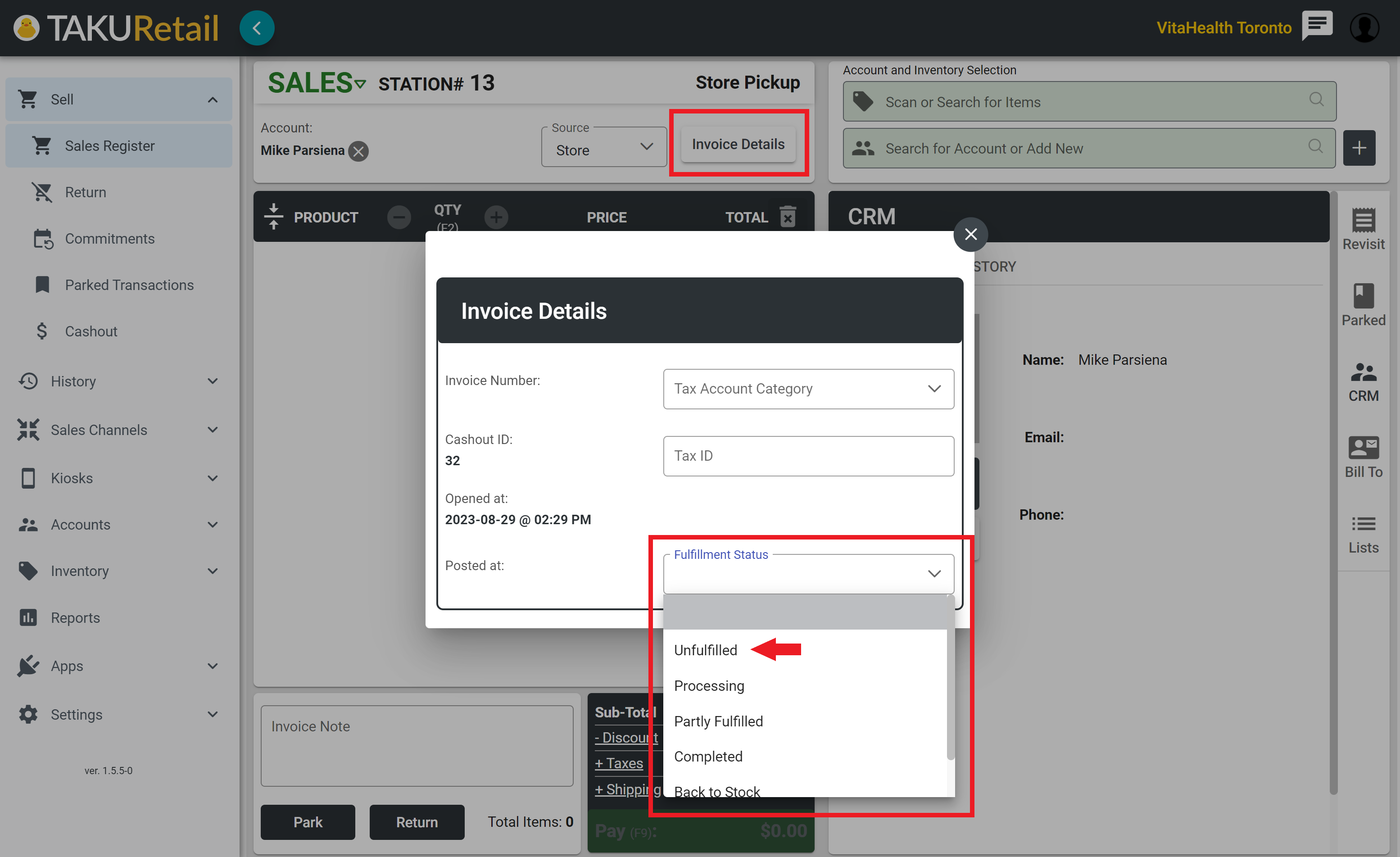 Click the Invoice Details button to change the Fulfillment Status to Unfulfilled