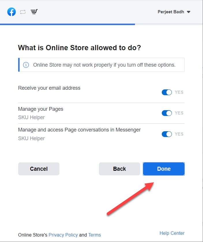 4. Give Facebook required access to your page and click “Done”.